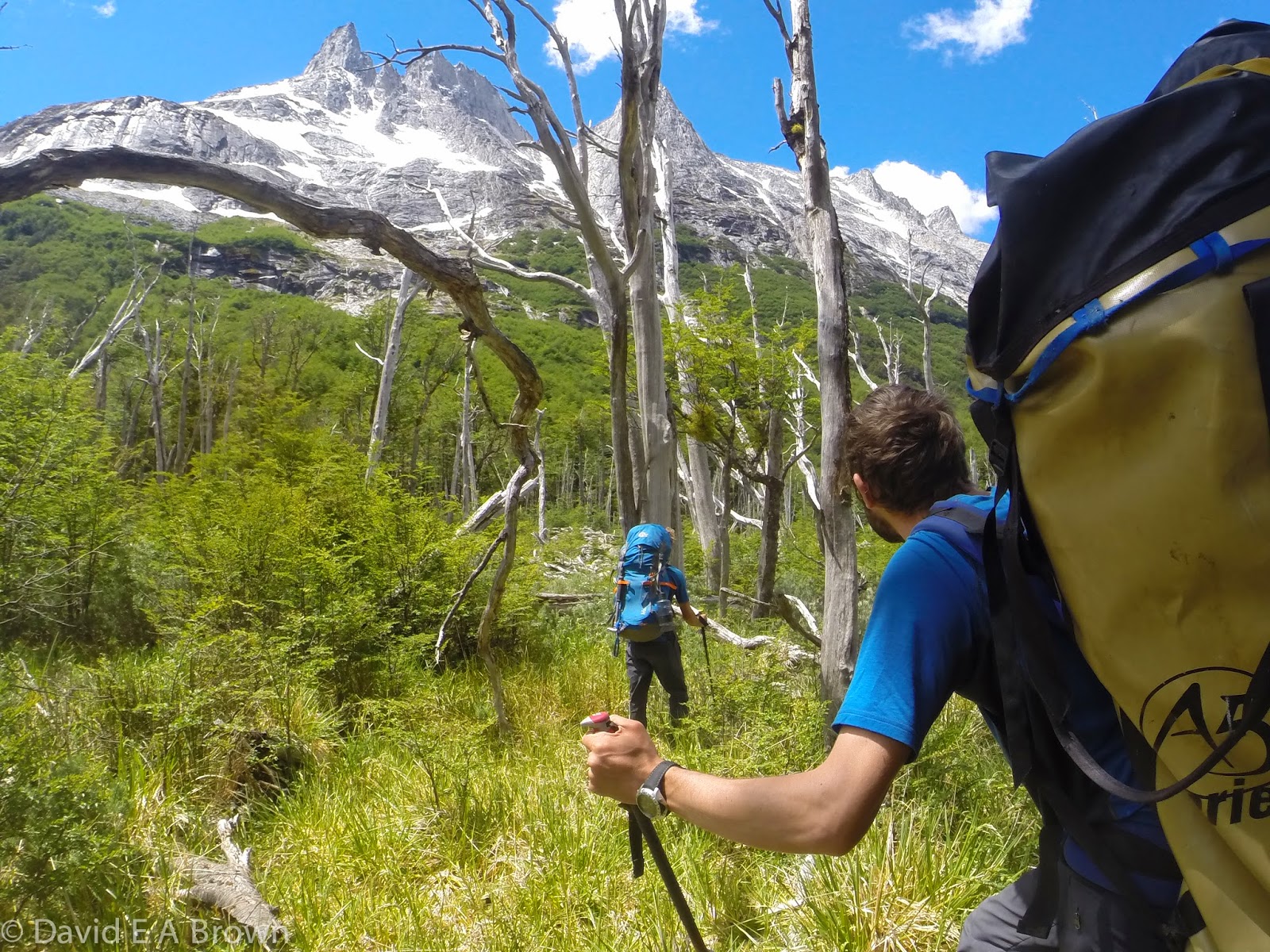 After the inevitably later than expected start the next day we headed up the valley towards the base of our wall. Five hours later Louis stopped at the base of the side valley in which our destination lay, declaring us to be there. Whilst we definitely weren’t there yet, we had to agree that we were at the end of the trail suitable for haul-bag laden horses. A brief re-pack later and we set off to carry the first of three loads up to what would become our base camp. Up to this point the scenery had been stunning and the going easy, following cow tracks along a fairly flat valley with only the occasional river crossing to add interest. The last few kilometers to the base of the moraine that became home for the next couple of weeks proved more challenging, involving a good deal of scrambling over fallen trees and wading through rivers. The pay back was that we were now in a completely pristine environment, surrounded by alpine rainforests leading to pointy granite peaks, with only condors for company.
