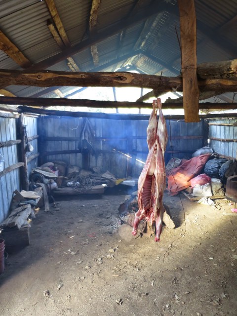 The Valley is inhabited by three farmers, a large number of cows, sheep and most importantly horses. Pascual had radioed ahead, and we were met by Louis, who had agreed to provide transport for our equipment. Once it had been established that we were definitely not keen on getting onto some particularly frisky looking horses the bags were loaded up and we were on our way. Following a few hours walk we spent our first night in the valley camped at Louis’ farm, complete with a freshly slaughtered and spit-roasted goat supper.